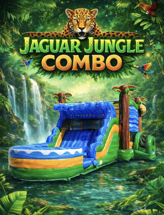 Step into the wild with our Jaguar Jungle Combo! This vibrant inflatable features a jungle-themed bounce area with obstacle pop-ups, plus an exciting slide for extra thrills. With palm trees, bold colors, and a fierce hidden jaguar watching over the fun, it’s the perfect combo for high-energy play.