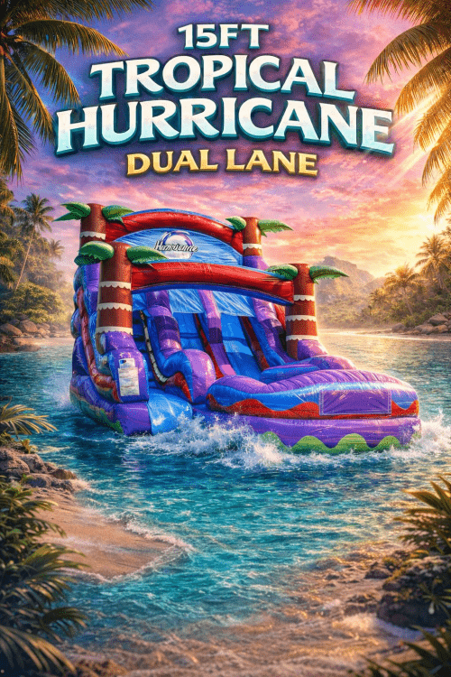 Make a splash at your next event with our 15ft Tropical Hurricane Dual Lane Waterslide, one of the most exciting options for water slide rentals near Summerville, SC. This vibrant inflatable features bold tropical colors with purples, blues, greens, and reds, paired with palm tree accents that instantly bring fun, beachy energy to any setup.